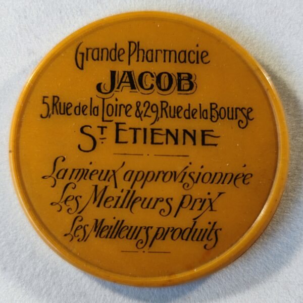 Miroir rond sous plastique. Fond brun, lettres noires.