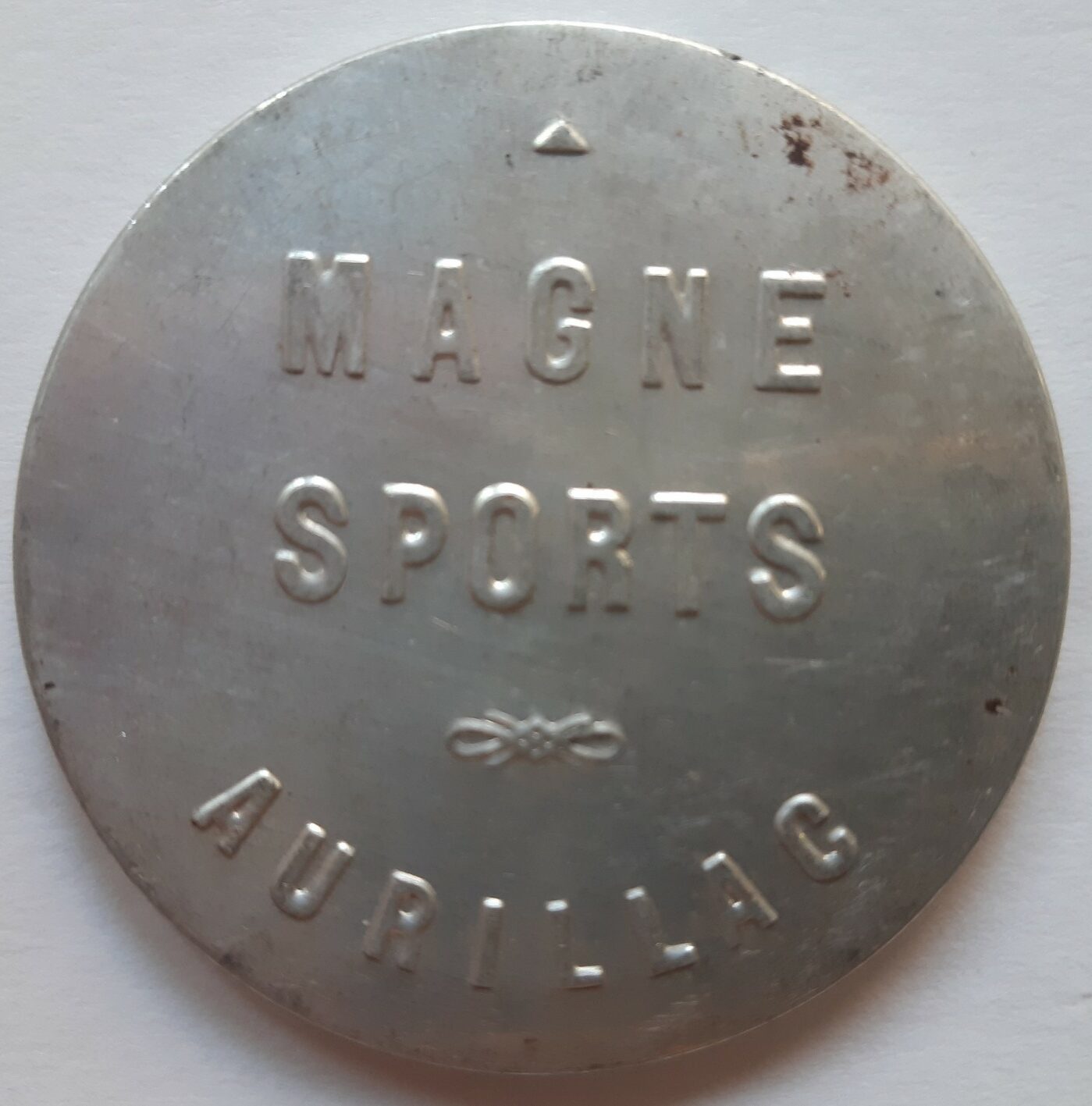 « Magne Sports, Aurillac ». . Petit miroir (légèrement piqué) rond, aluminium, gravé en relief.