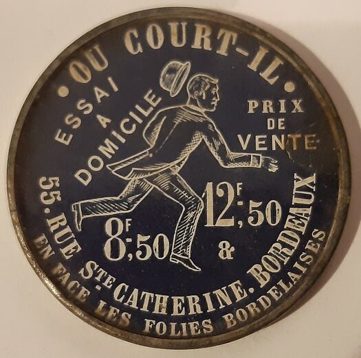 Petit miroir rond, sous verre, entourage en aluminium, fond bleu, lettres blanches. Dessin en bleu et blanc.