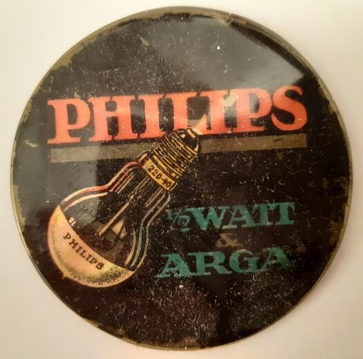 A gauche, le dessin d’une ampoule semi opaque marquée « PHILIPS » en lettres capitales noires.