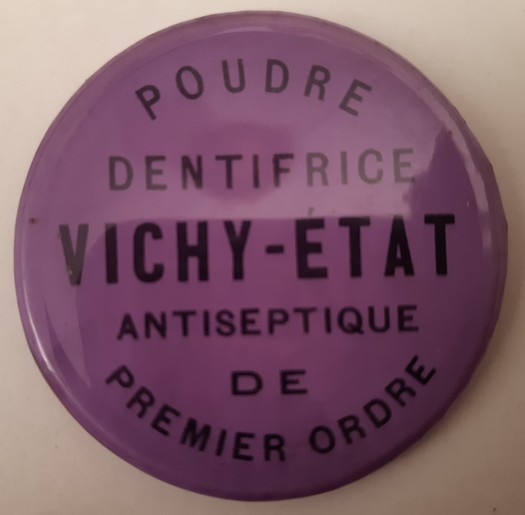 Miroir rond sous plastique. Fond violet, lettres noires.